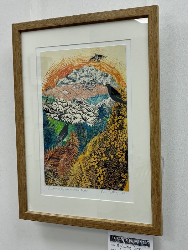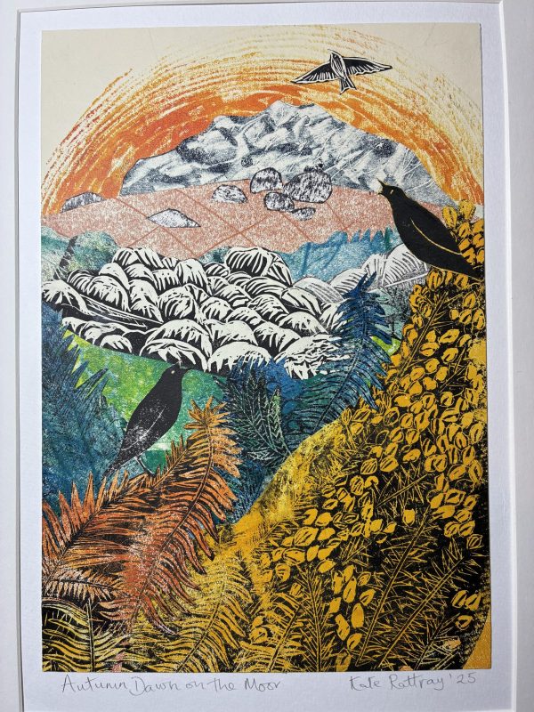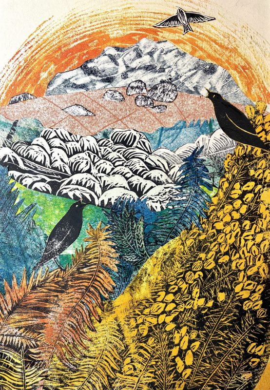 Original Lino cut collage depicting a view from a path I walk with Houndtor in the distance.