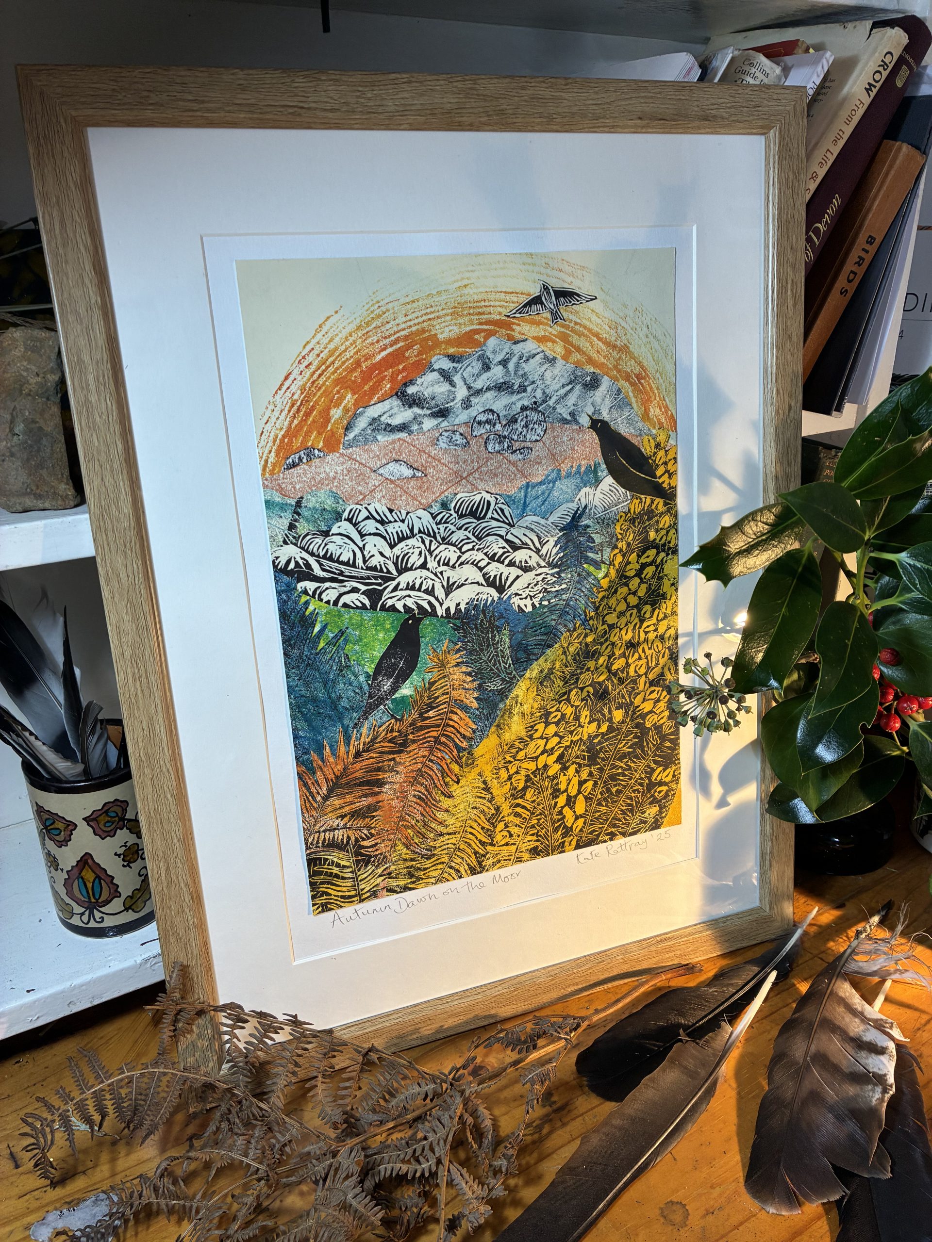 Original Lino cut / monoprint collage depicting a view from a path I walk with Houndtor in the distance.